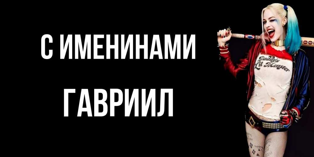Открытка С именинами Гавриил. харли квинн улыбнись. пожелания быть позитивным