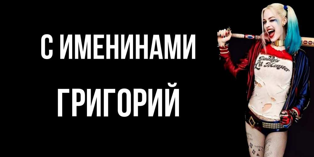 Открытка С именинами Григорий. харли квинн улыбнись. пожелания быть позитивным