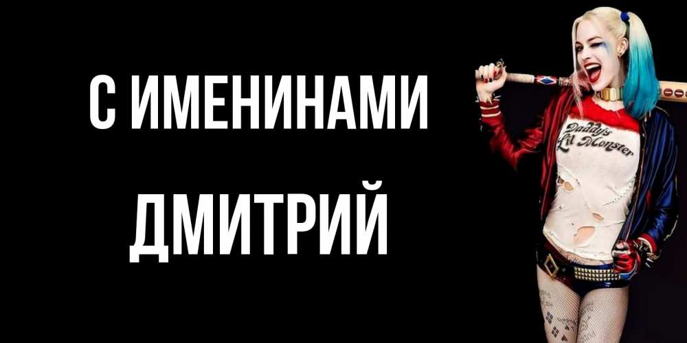 Открытка С именинами Дмитрий. харли квинн улыбнись. пожелания быть позитивным