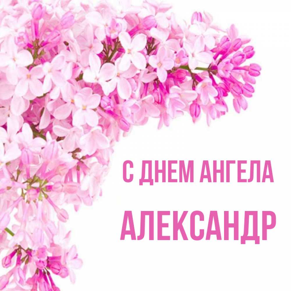 Открытка С днем Ангела Александр. Поздравительная открытка на день рождения с сиренью и подписью. Сирень на белом фоне
