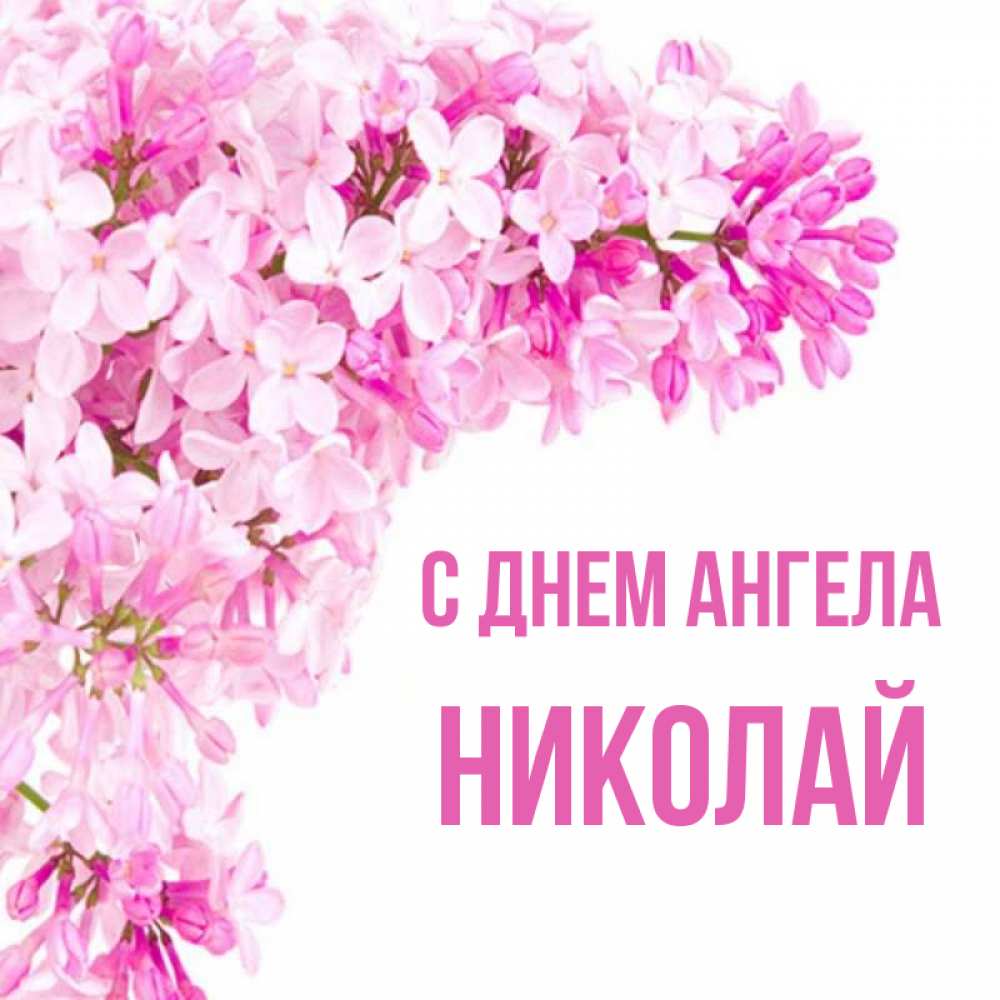 Открытка С днем Ангела Николай. Поздравительная открытка на день рождения с сиренью и подписью. Сирень на белом фоне