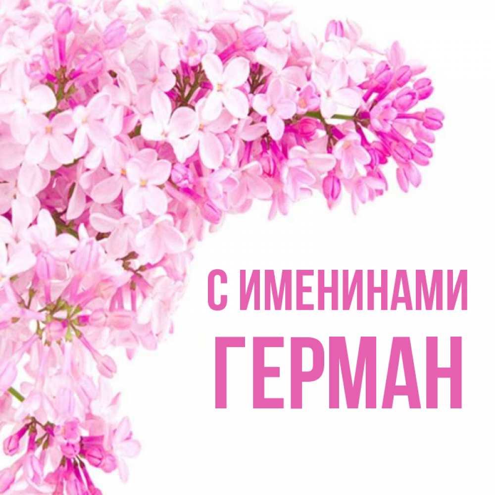 Открытка С именинами Герман. Поздравительная открытка на день рождения с сиренью и подписью. Сирень на белом фоне