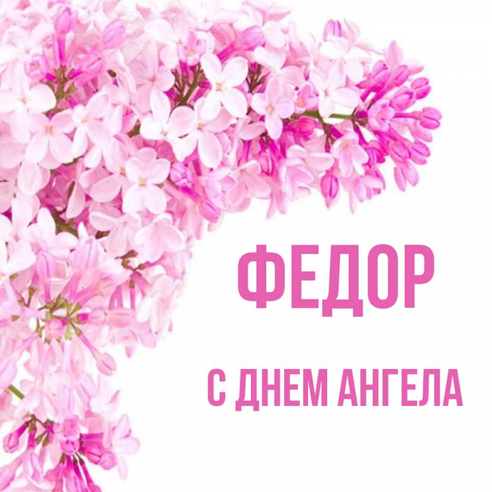 Открытка Федор С днем ангела. Поздравительная открытка на день рождения с сиренью и подписью. Сирень на белом фоне