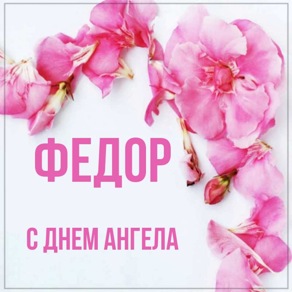 Открытка Федор С днем ангела. Поздравительная открытка с розовыми цветами на рамочке. Красивая открытка для поздравления с днем рождения