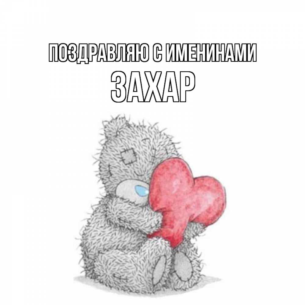 Открытка Поздравляю с именинами Захар. Мишка Тедди с сердечком любит тебя. открытка для любимой девушки или парня с медвежонком Тедди