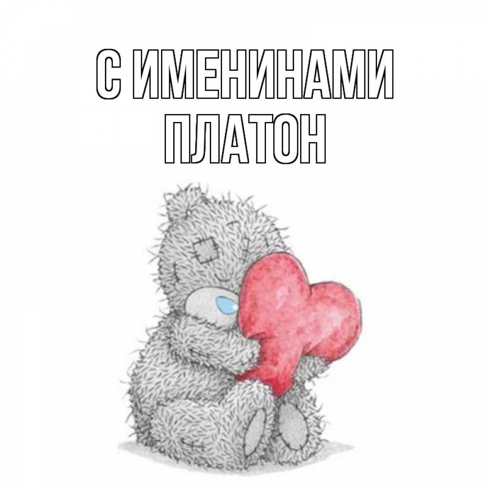 Открытка С именинами Платон. Мишка Тедди с сердечком любит тебя. открытка для любимой девушки или парня с медвежонком Тедди