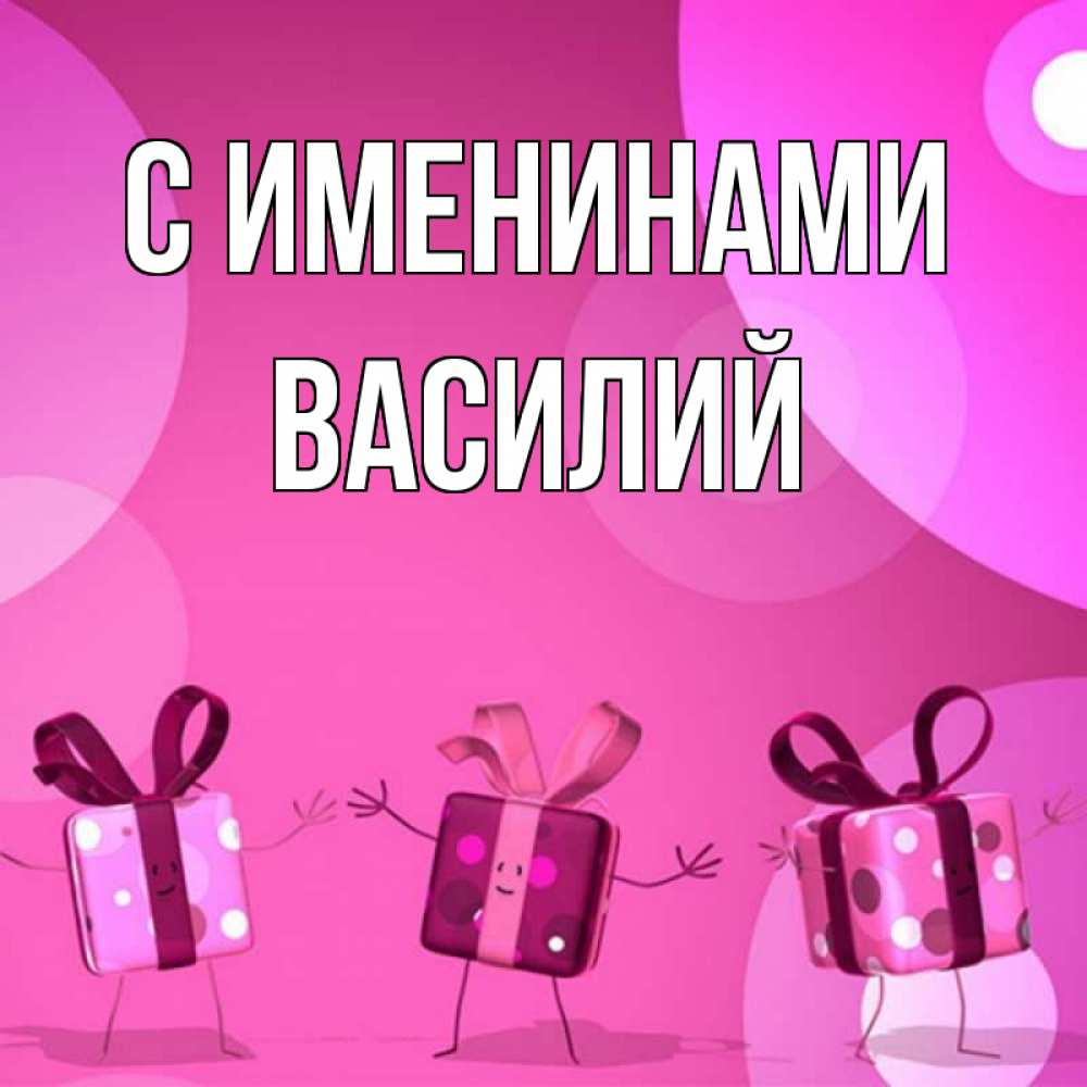 Открытка С именинами Василий. подарки на розовом фоне. подарки с ножкам
