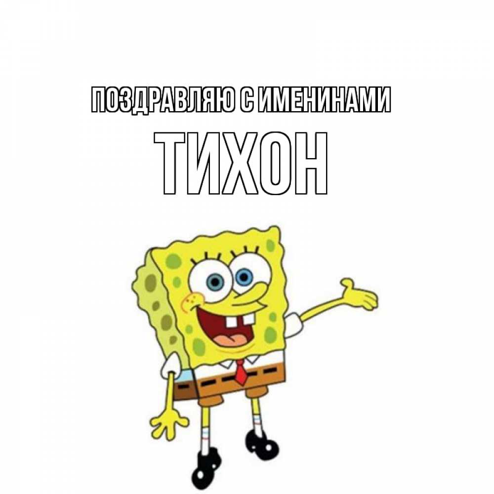 Открытка Поздравляю с именинами Тихон. спанч Боб машет рукой. веселые