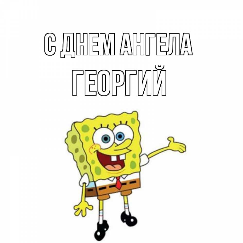 Открытка С днем Ангела Георгий. спанч Боб машет рукой. веселые