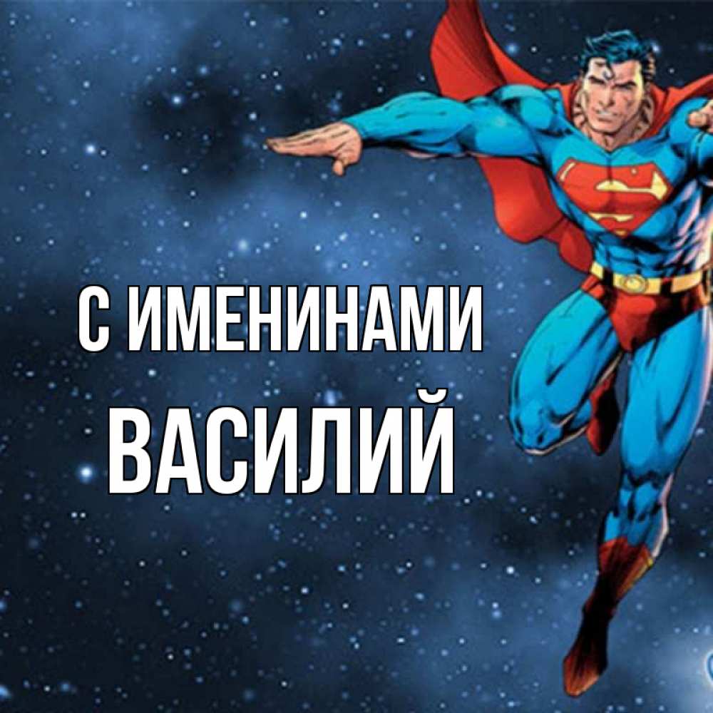 Открытка С именинами Василий. Супермен. супергерой