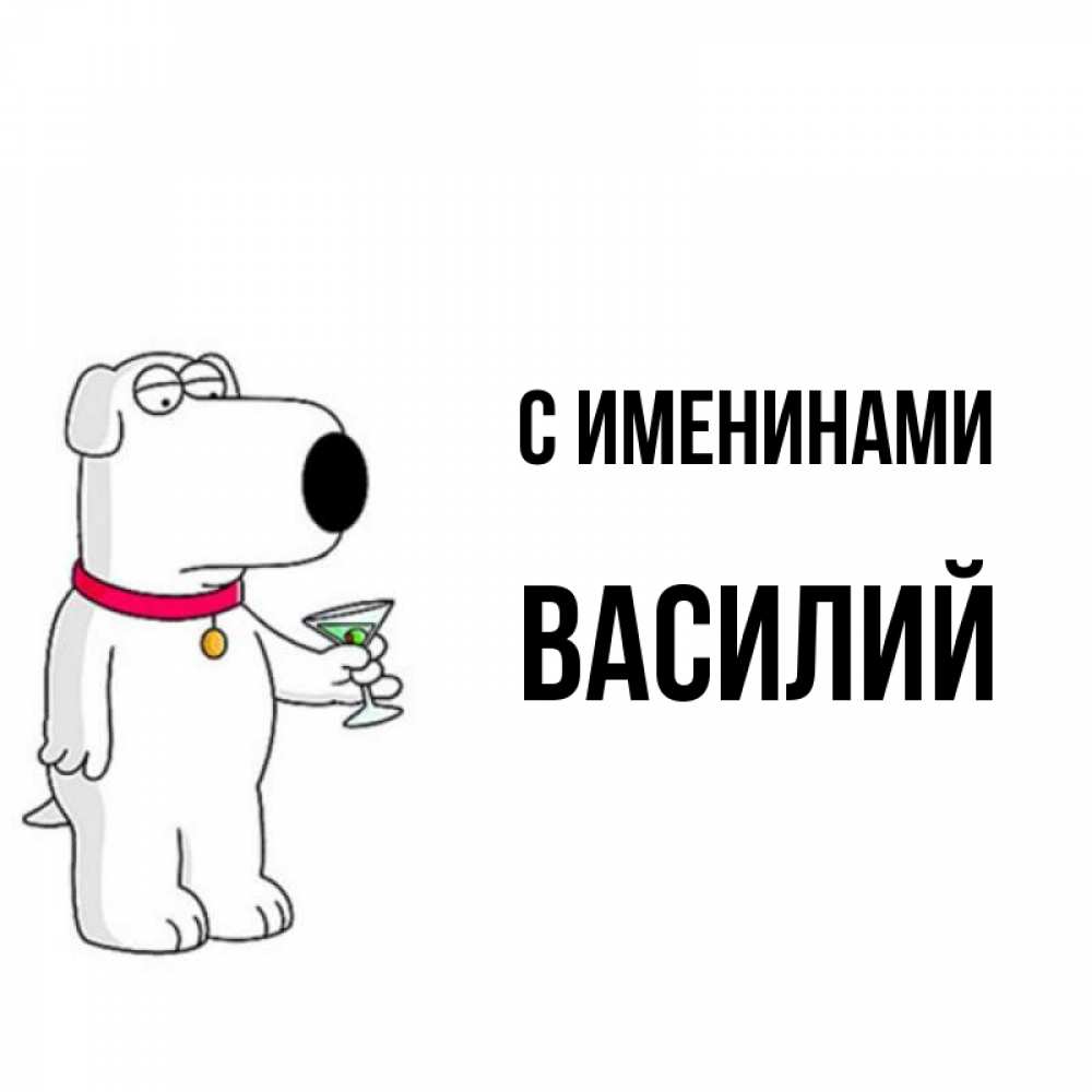 Открытка С именинами Василий. С днем рождения от песика. песик с оливками