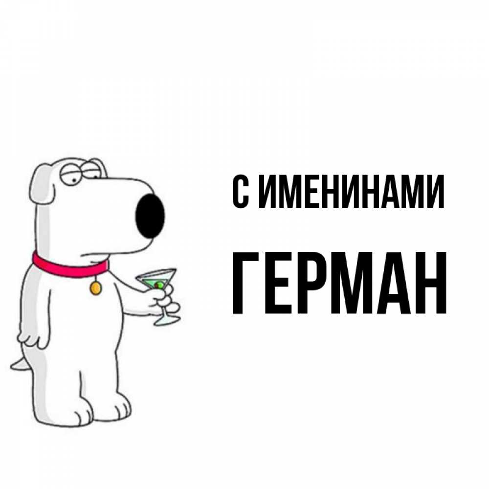 Открытка С именинами Герман. С днем рождения от песика. песик с оливками
