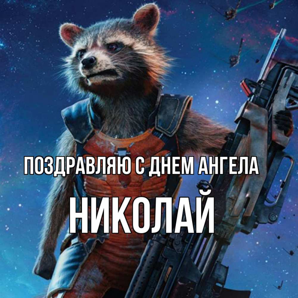 Открытка Поздравляю с днем Ангела Николай. енот из стражи галактики. реактивный Рокета
