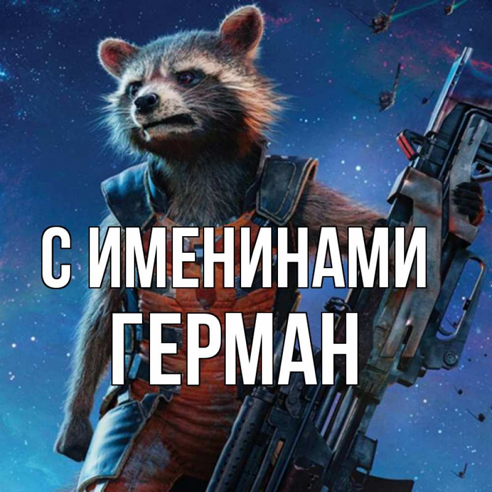 Открытка С именинами Герман. енот из стражи галактики. реактивный Рокета