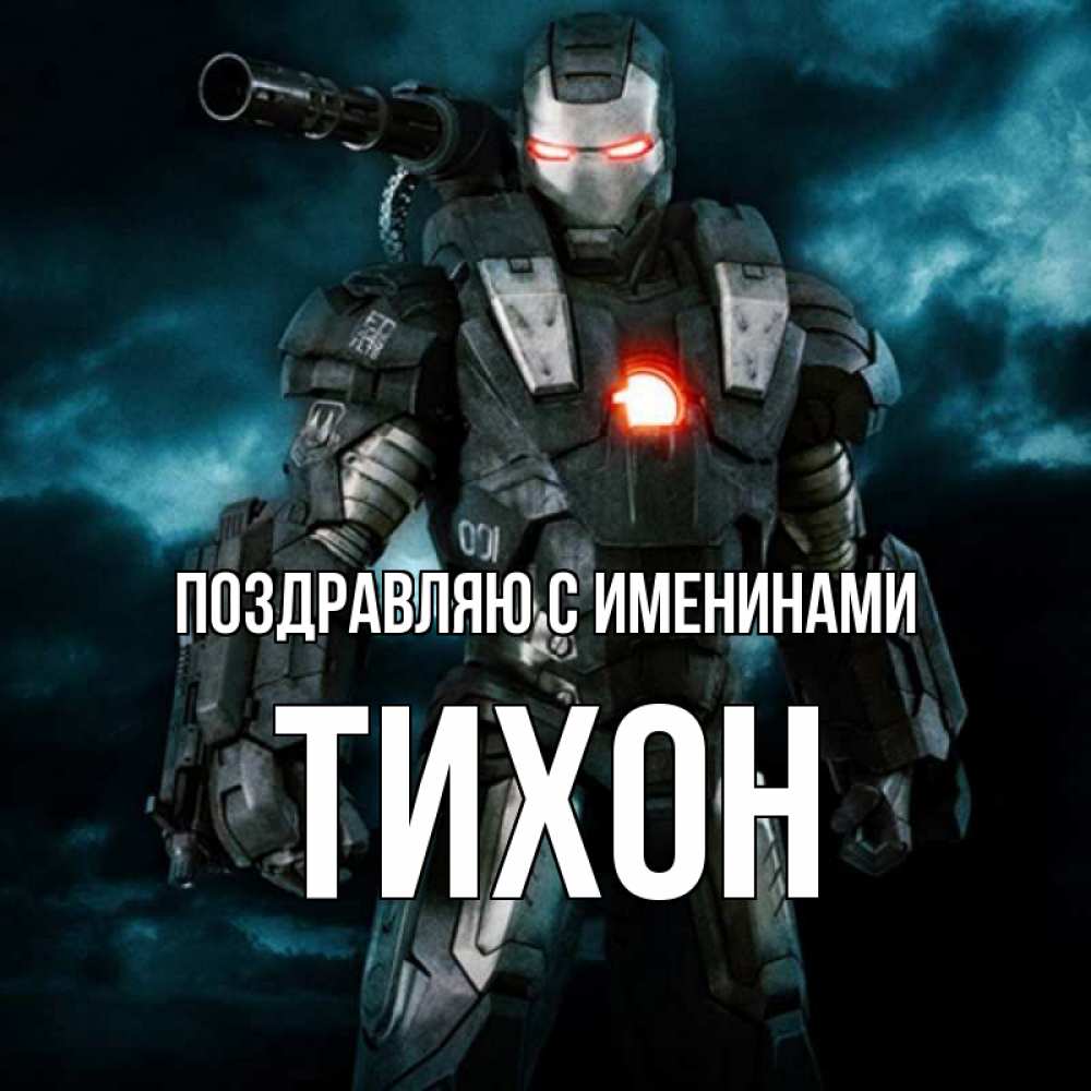 Открытка Поздравляю с именинами Тихон. железный челове с большой пушкой. марвел супергерой в новом костюме