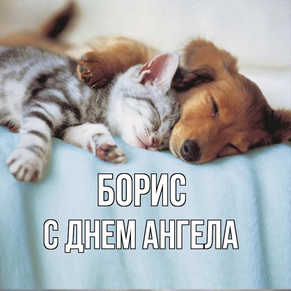 Открытка Борис С днем ангела. Спокойной ночи желают кот и собака которые спят в обнимку. с животными