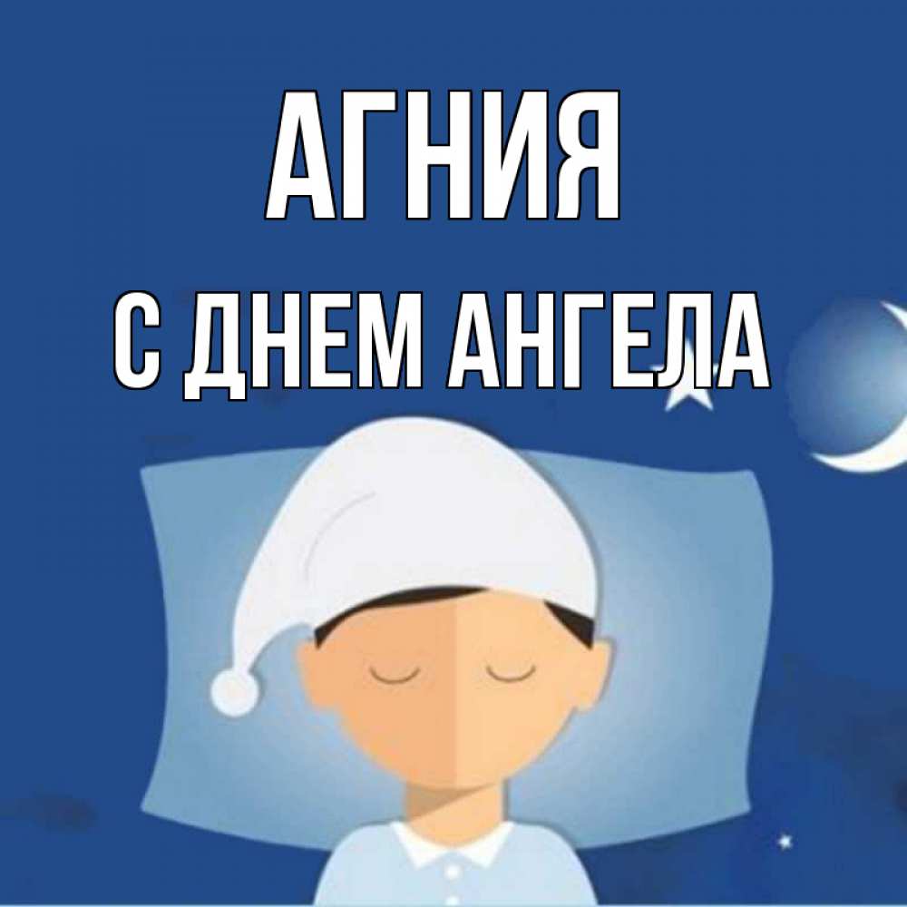 Открытка Агния С днем ангела. человек в пижаме ложится спать. подушка и шапочка