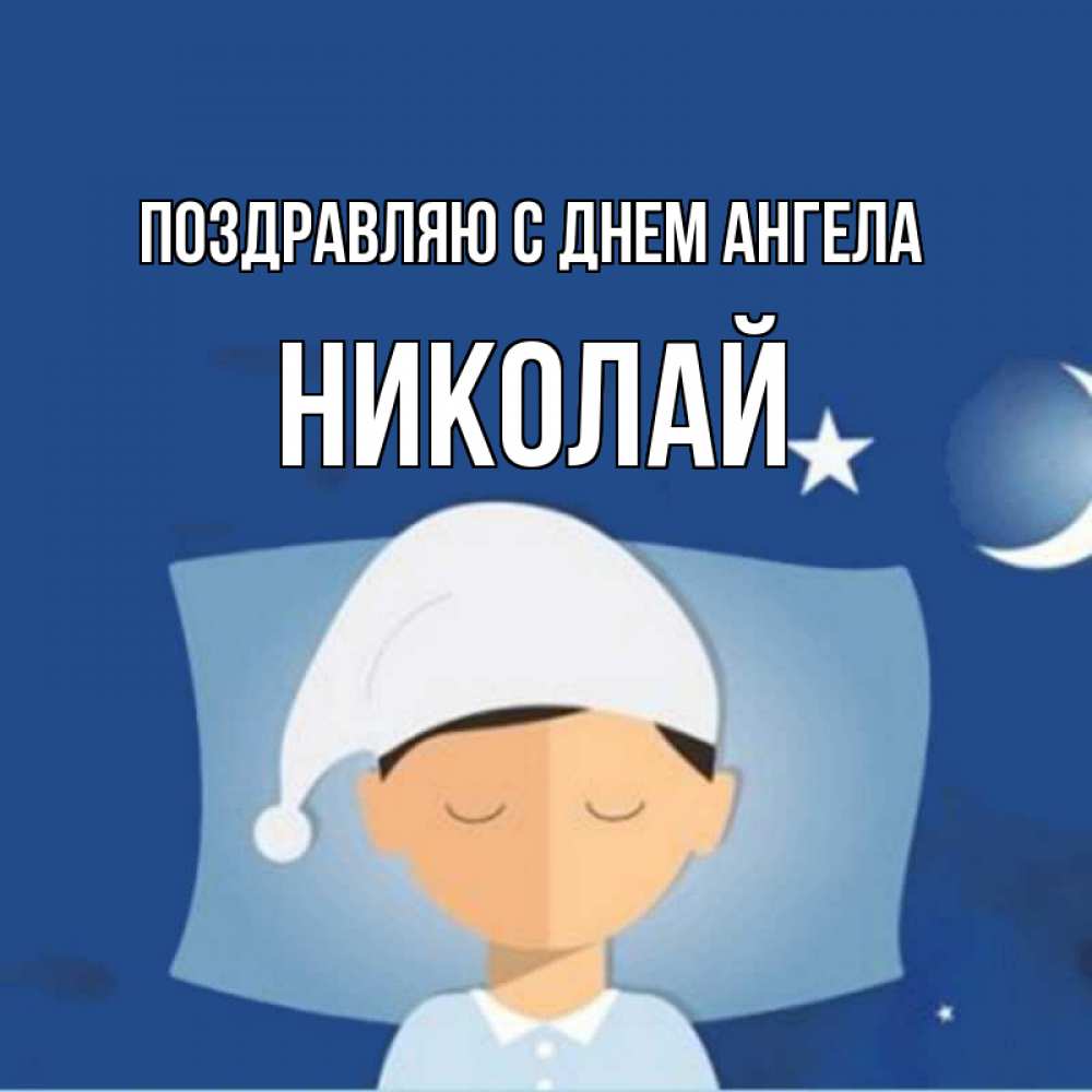 Открытка Поздравляю с днем Ангела Николай. человек в пижаме ложится спать. подушка и шапочка
