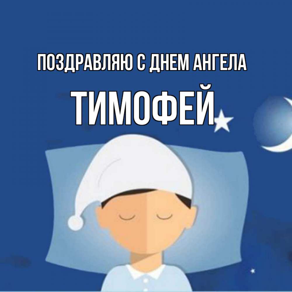 Открытка Поздравляю с днем Ангела Тимофей. человек в пижаме ложится спать. подушка и шапочка