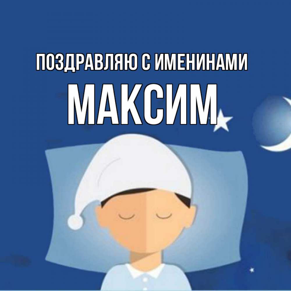 Открытка Поздравляю с именинами Максим. человек в пижаме ложится спать. подушка и шапочка