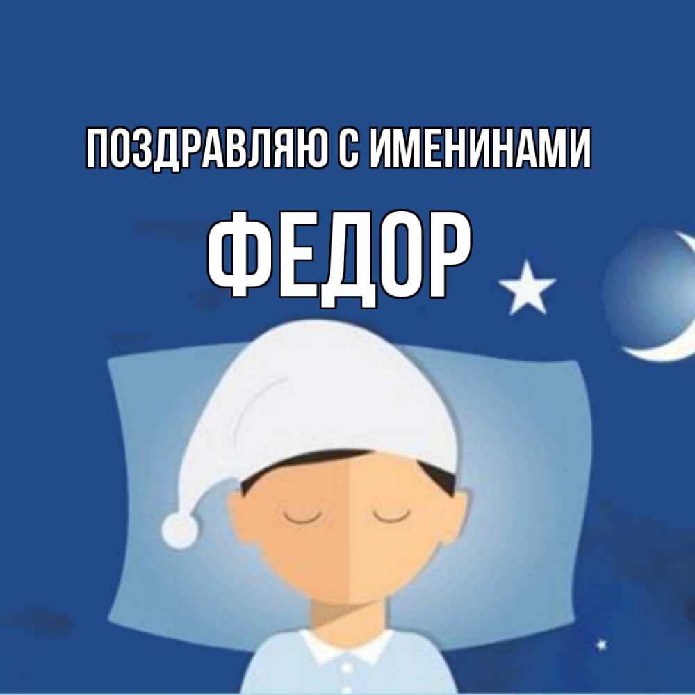 Открытка Поздравляю с именинами Федор. человек в пижаме ложится спать. подушка и шапочка