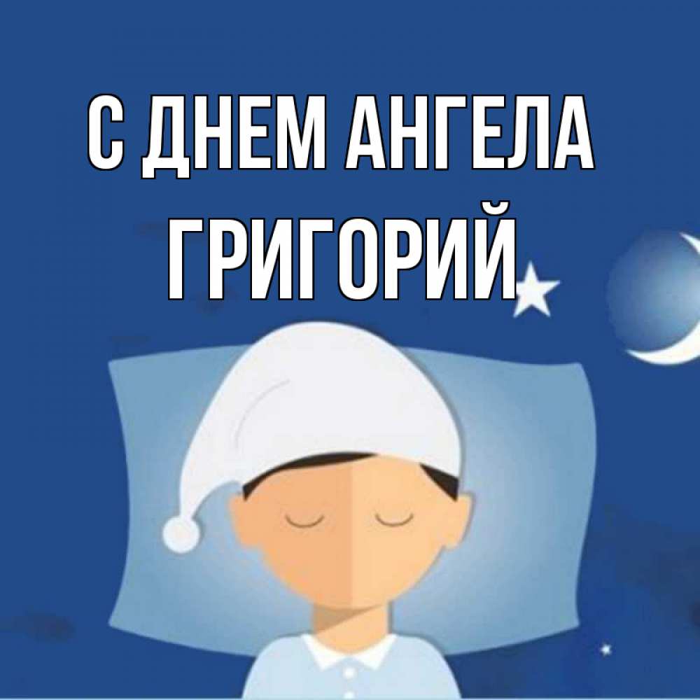 Открытка С днем Ангела Григорий. человек в пижаме ложится спать. подушка и шапочка