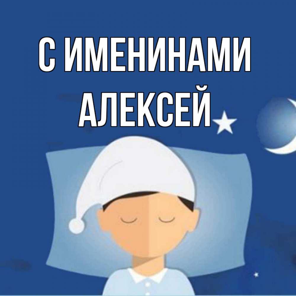 Открытка С именинами Алексей. человек в пижаме ложится спать. подушка и шапочка