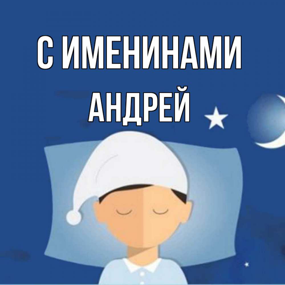 Открытка С именинами Андрей. человек в пижаме ложится спать. подушка и шапочка