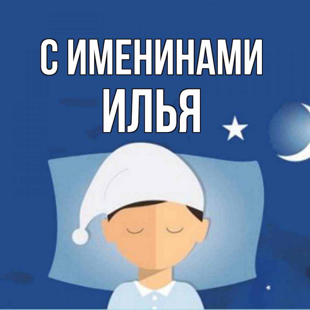 Открытка С именинами Илья. человек в пижаме ложится спать. подушка и шапочка