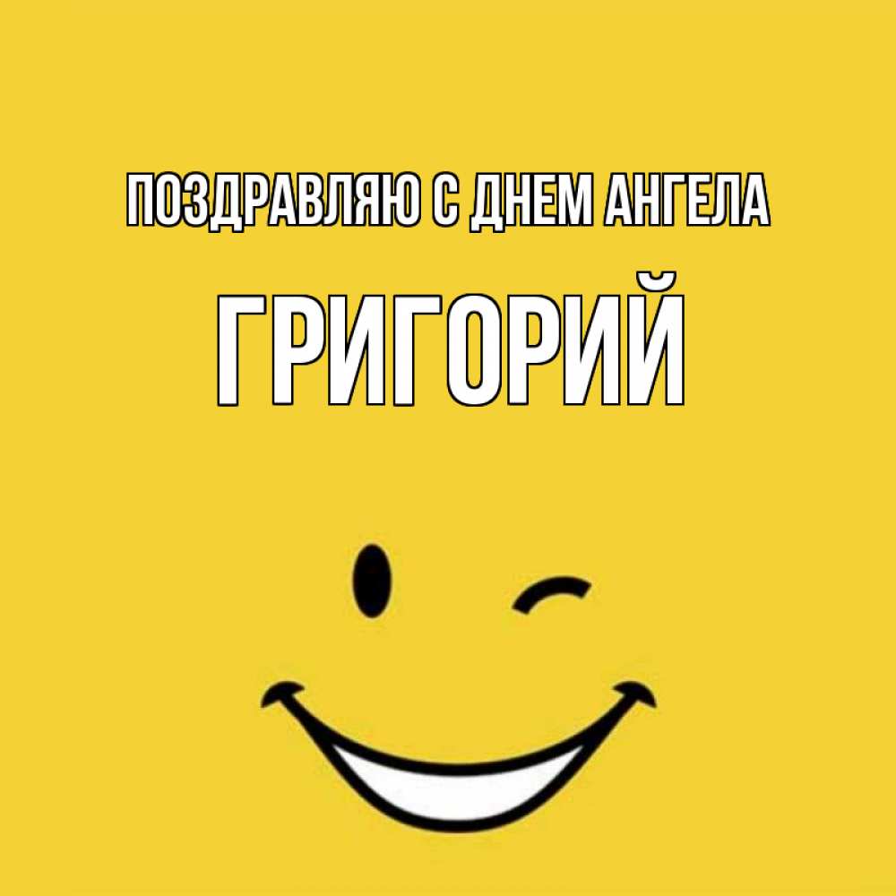 Открытка Поздравляю с днем Ангела Григорий. Смайл улыбается и подмигивает. оранжевый фон