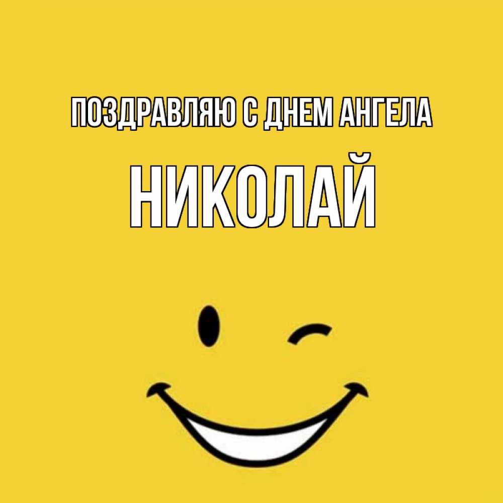 Открытка Поздравляю с днем Ангела Николай. Смайл улыбается и подмигивает. оранжевый фон