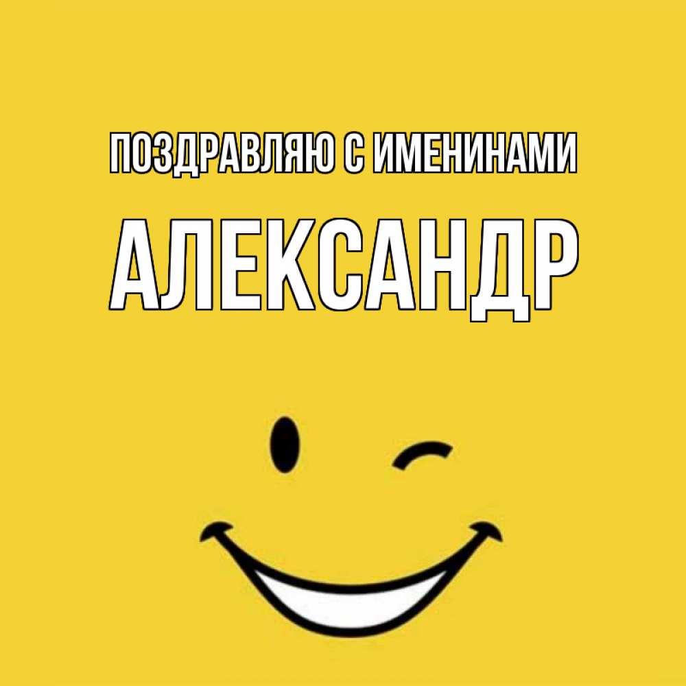 Открытка Поздравляю с именинами Александр. Смайл улыбается и подмигивает. оранжевый фон