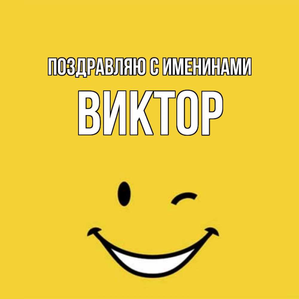 Открытка Поздравляю с именинами Виктор. Смайл улыбается и подмигивает. оранжевый фон
