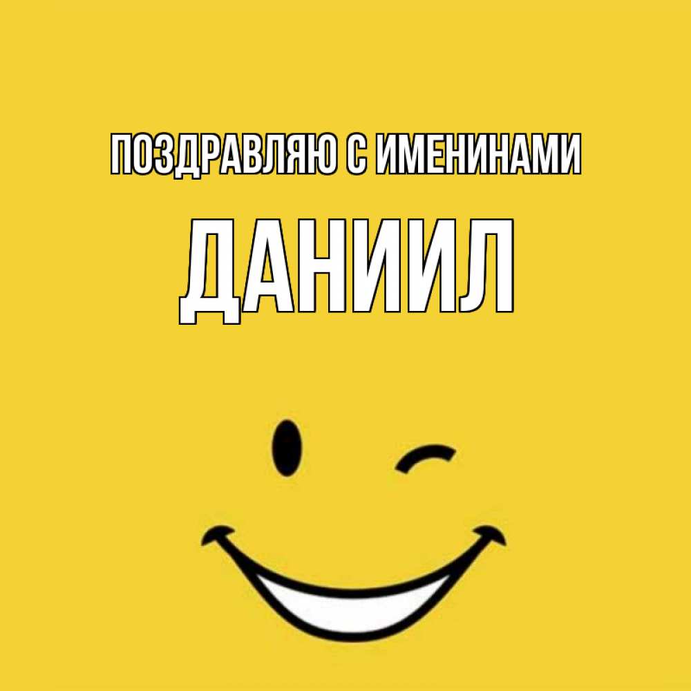 Открытка Поздравляю с именинами Даниил. Смайл улыбается и подмигивает. оранжевый фон