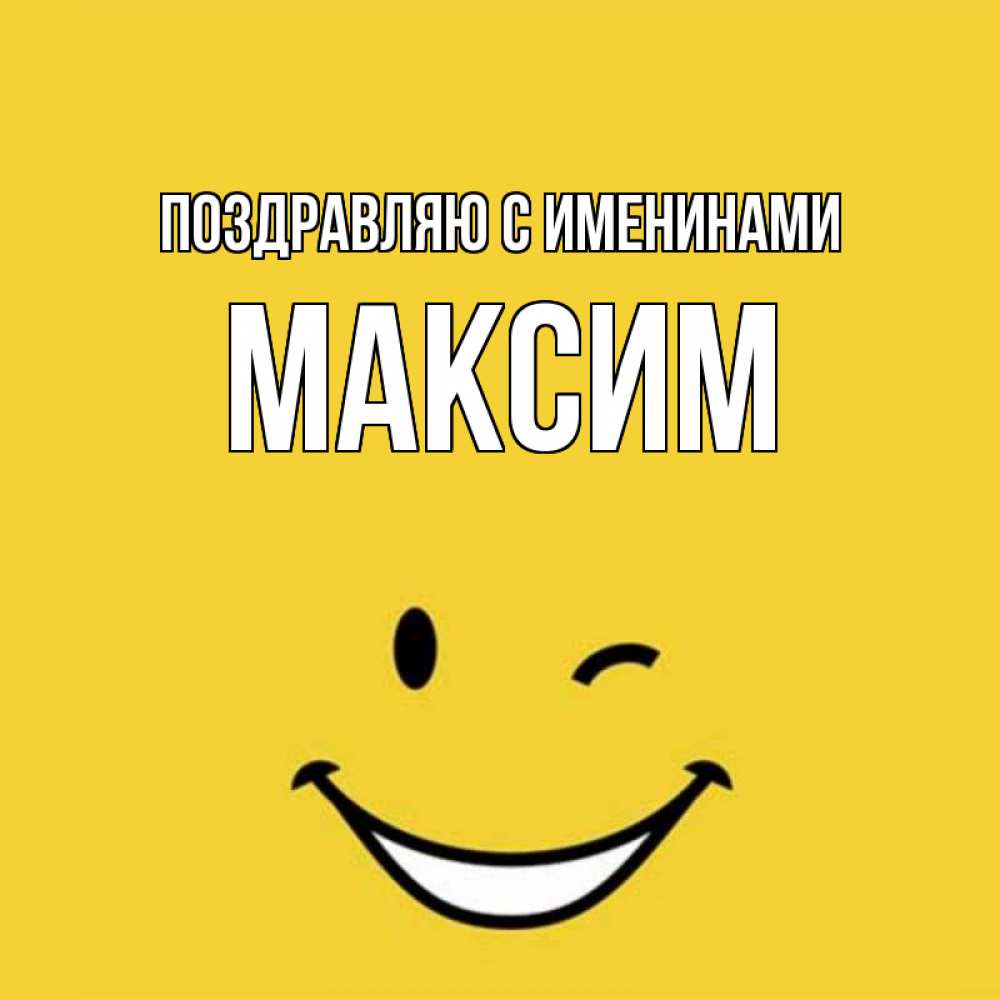 Открытка Поздравляю с именинами Максим. Смайл улыбается и подмигивает. оранжевый фон