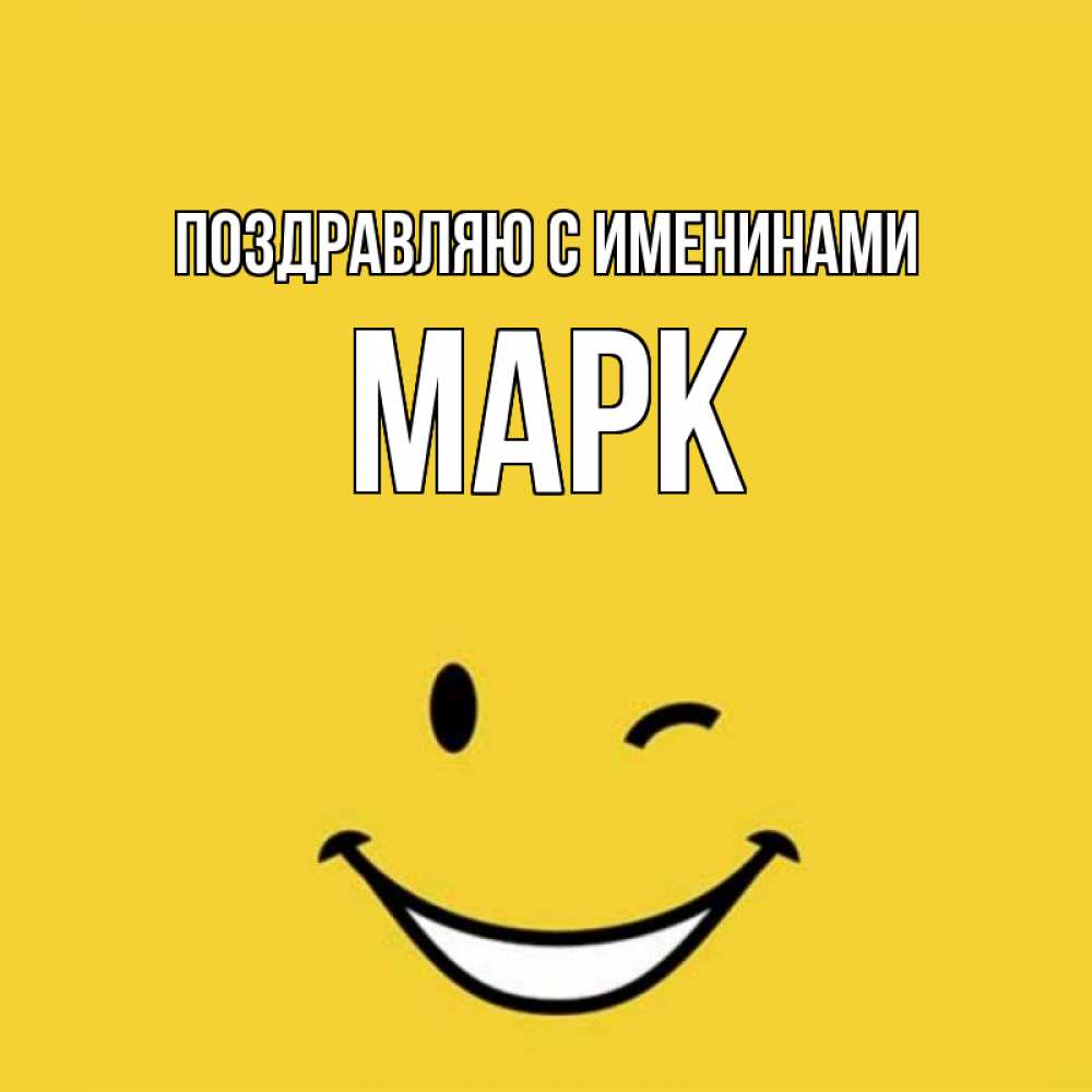 Открытка Поздравляю с именинами Марк. Смайл улыбается и подмигивает. оранжевый фон