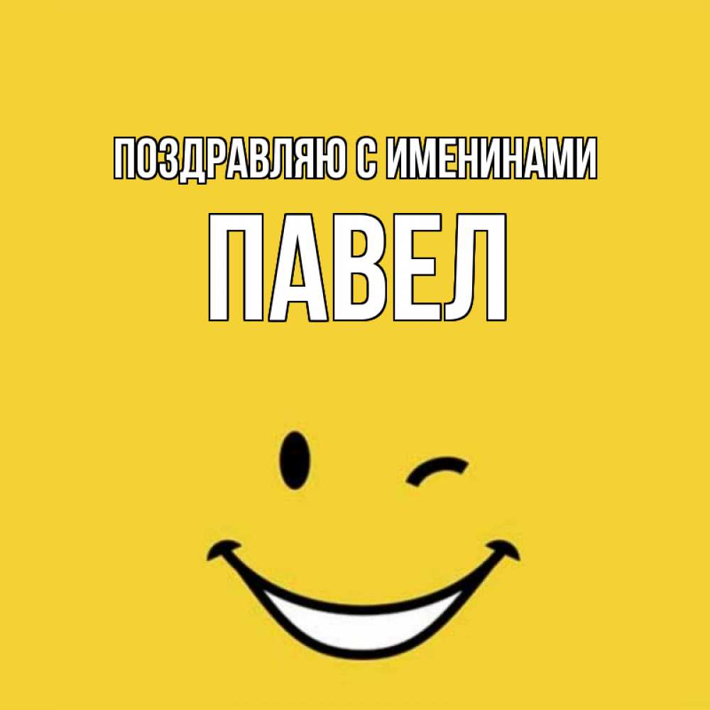 Открытка Поздравляю с именинами Павел. Смайл улыбается и подмигивает. оранжевый фон