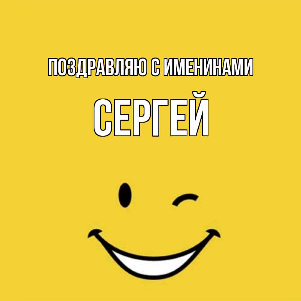 Открытка Поздравляю с именинами Сергей. Смайл улыбается и подмигивает. оранжевый фон