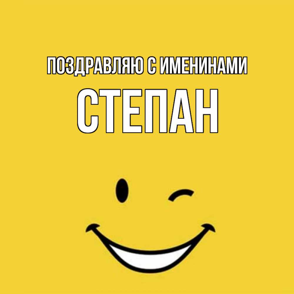 Открытка Поздравляю с именинами Степан. Смайл улыбается и подмигивает. оранжевый фон