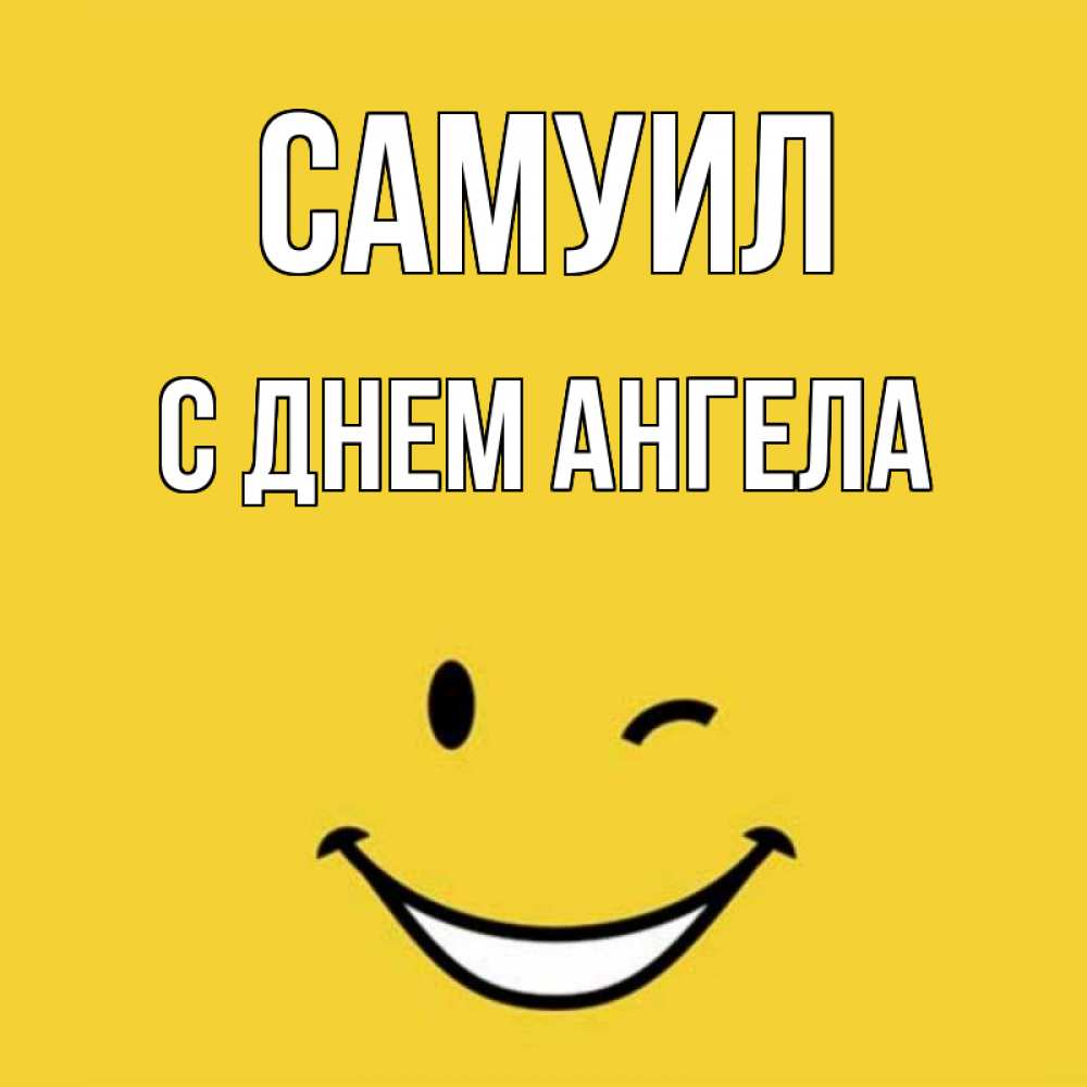 Открытка Самуил С днем ангела. Смайл улыбается и подмигивает. оранжевый фон
