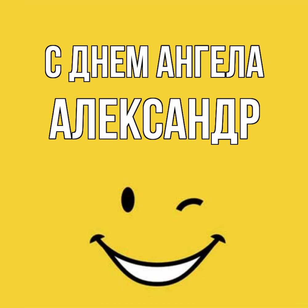 Открытка С днем Ангела Александр. Смайл улыбается и подмигивает. оранжевый фон