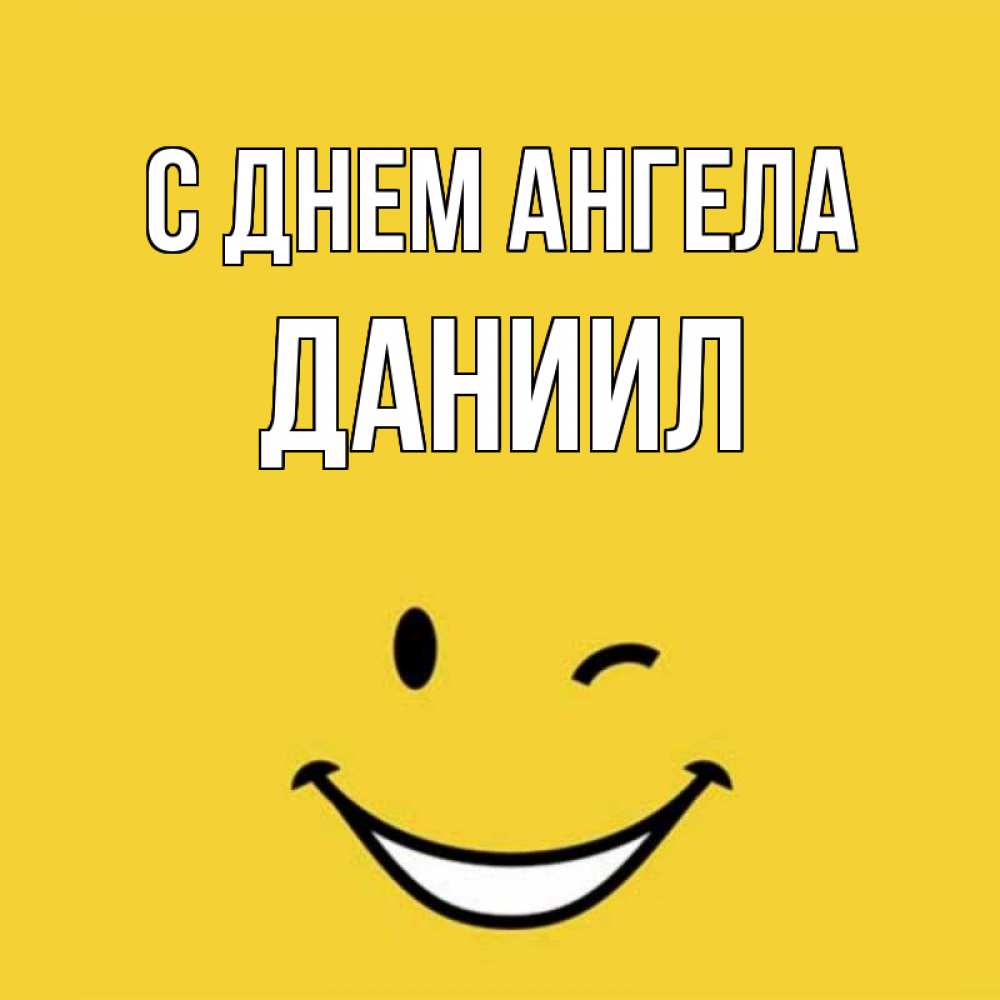 Открытка С днем Ангела Даниил. Смайл улыбается и подмигивает. оранжевый фон