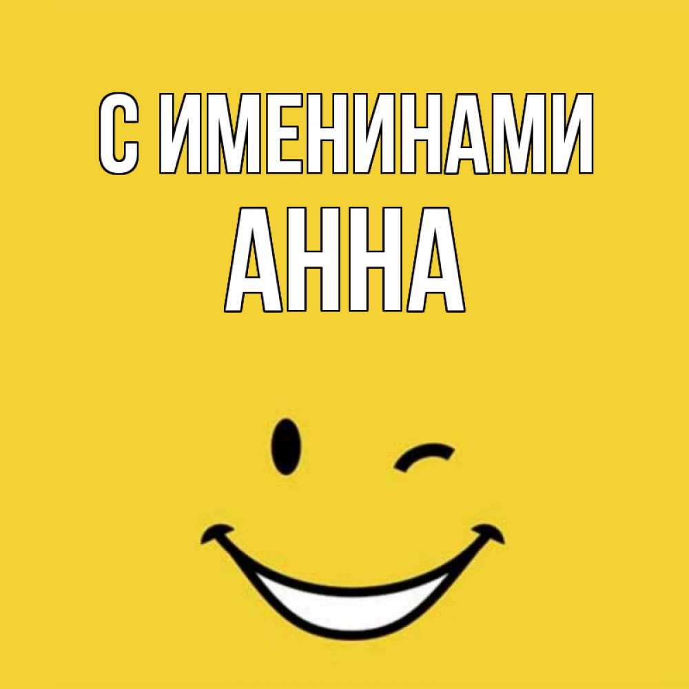 Открытка С именинами Анна. Смайл улыбается и подмигивает. оранжевый фон