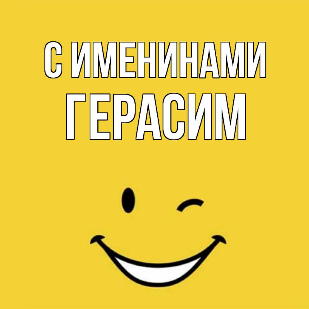 Открытка С именинами Герасим. Смайл улыбается и подмигивает. оранжевый фон