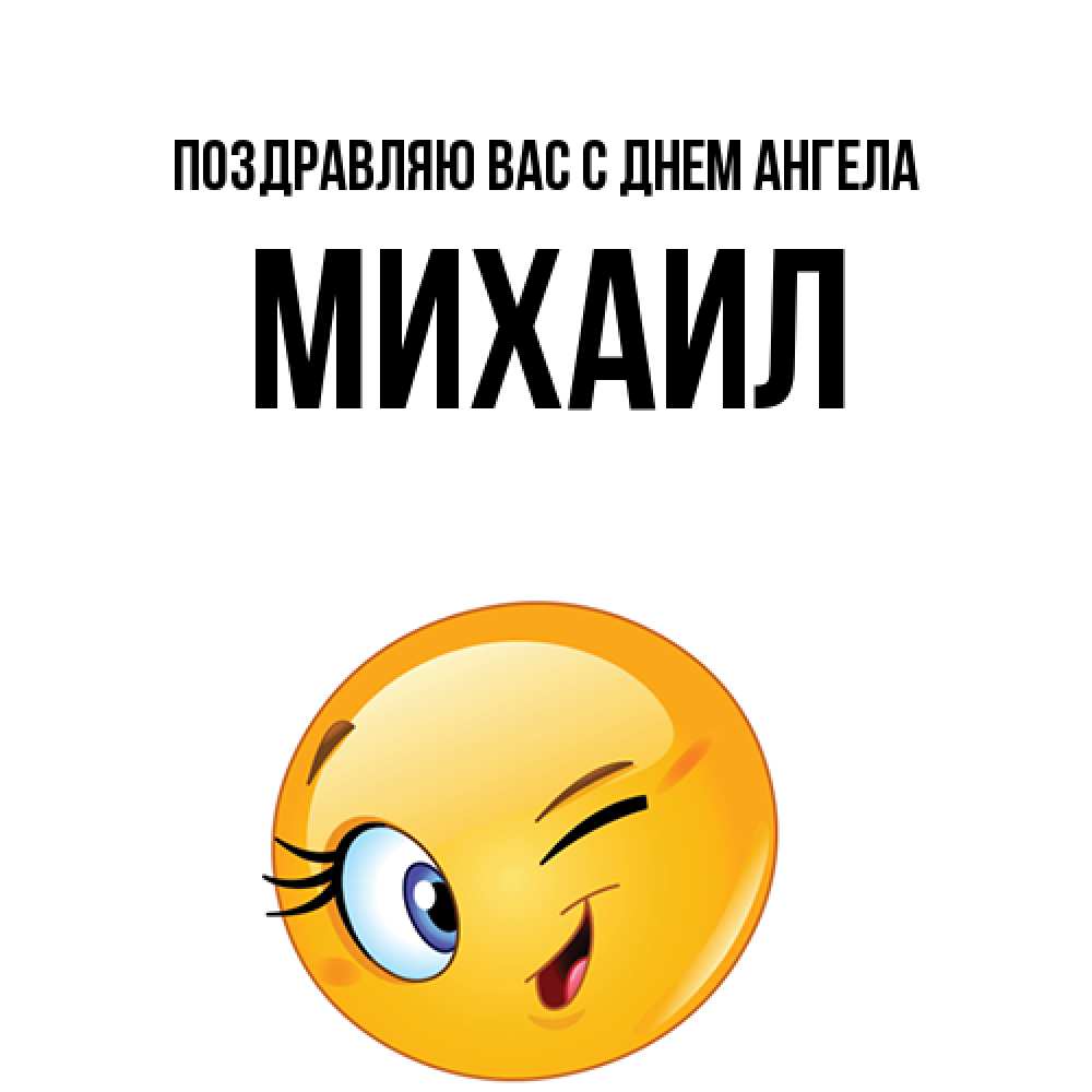 Открытка Поздравляю Вас с днем Ангела Михаил. Круглый смайл подмигивает и улыбается. хорошее настроение