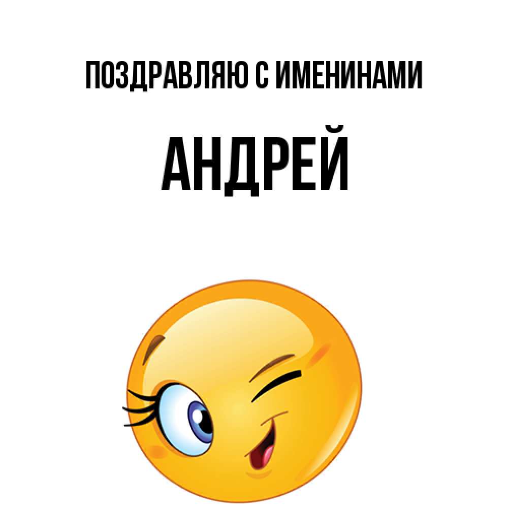 Открытка Поздравляю с именинами Андрей. Круглый смайл подмигивает и улыбается. хорошее настроение