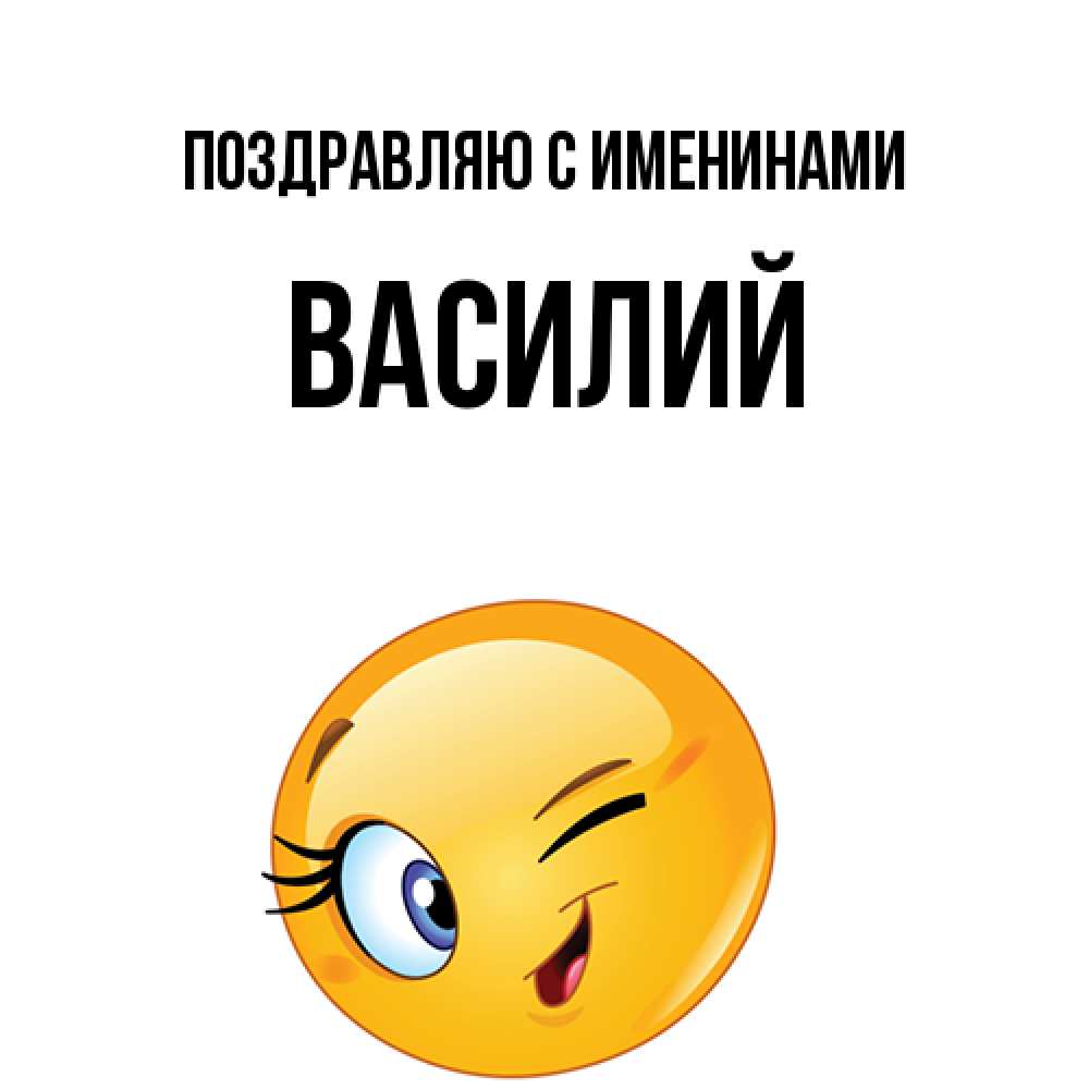 Открытка Поздравляю с именинами Василий. Круглый смайл подмигивает и улыбается. хорошее настроение