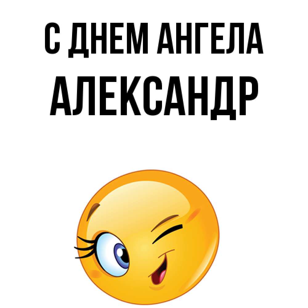 Открытка С днем Ангела Александр. Круглый смайл подмигивает и улыбается. хорошее настроение