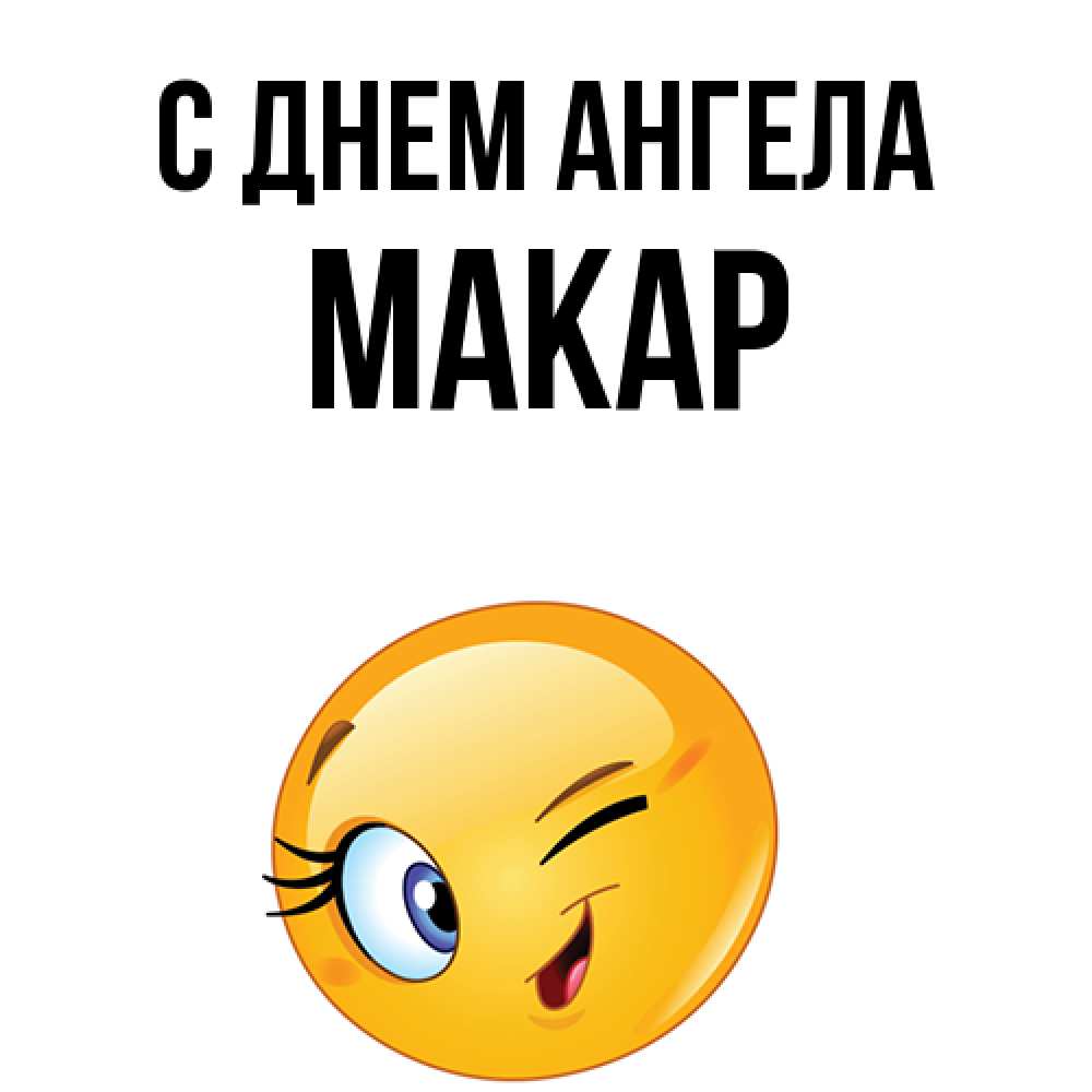 Открытка С днем Ангела Макар. Круглый смайл подмигивает и улыбается. хорошее настроение