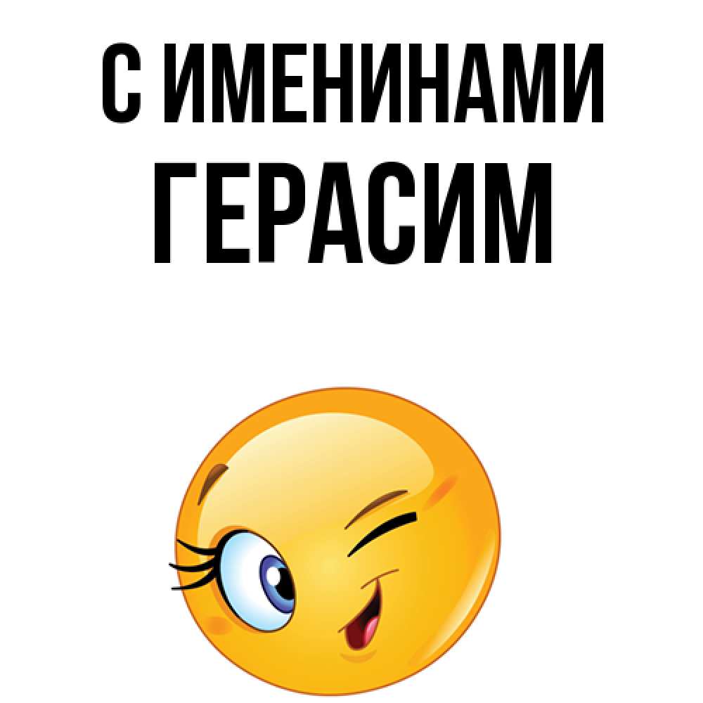 Открытка С именинами Герасим. Круглый смайл подмигивает и улыбается. хорошее настроение